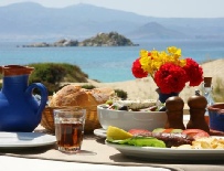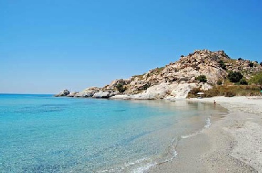 An idyllic bay with an exellent beach for bathing opens up. The church of Saint Stephanos, a remarkable byzantine monument built in red trachyte which is indeed a masterpiece, well worth visiting. The small islands opposite the coast are called the “Tokmakia”. One of them, “Aspronisi”, on the west side, has a beautiful beach with golden sand and blue waters. These features with the sound made by the cries of seagulls overhead, create a heavenly landscape. This is where the fullest and most delicious sea-urchins can be found, while the surrounding area is suitable for fishing. So, if you have a boat don’t miss this trip/promenade”.