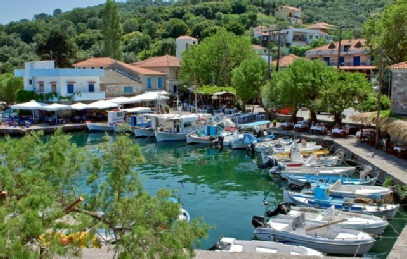 place to pick up ladotyri cheese (made from sheep and goat milk and aged in olive oil), feta, butter, and yoghurt made from sheep milk. Pass through Pelopi, which is crossed by the Tsiknias River, and continue on to Ypsilometopo, and then Stypsi and Petri, where there is a fine taverna with a great view of the Bay